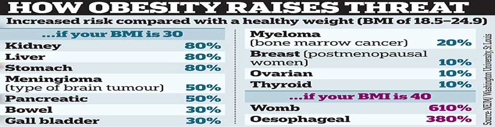 Washington: A study at Columbia University's Mailman School of Public Health showed that obesity was more prevalent in patients with a history of cancer than in the general population, and survivors of colorectal and breast cancers were particularly affected.
