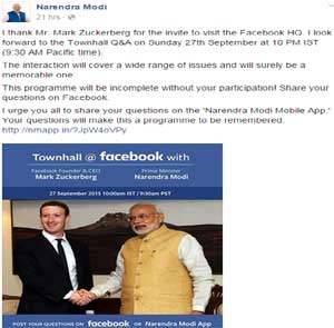 New Delhi: Prime Minister Narendra Modi has invited the questions for Townhall Question and Answer (Q&A) session to be held at Facebook Headquarters on September 27.