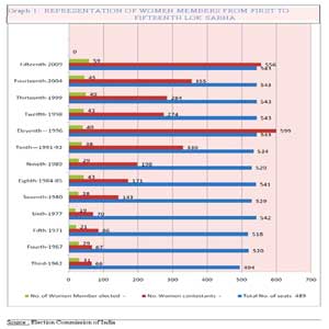 New Delhi: Representation of women members in Lok Sabha and their participation in general elections as contestants are increasing. General Election 2009 sent the highest number of women in Lok Sabha 59, while in previous House the number was 45. (See Graph 1) (Read In Hindi : महिलाओं का लोकसभा में प्रतिनिधित्व)