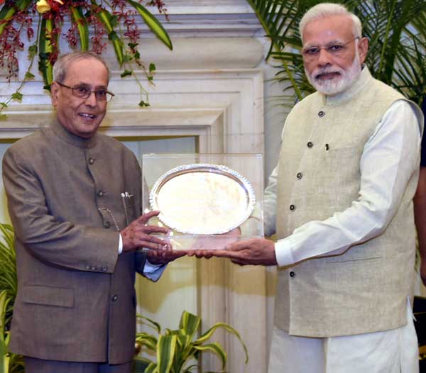 Prime Minister Narendra Modi presents a memento to the President Pranab Mukherjee on the occasion of farewell hosted by him for the President at Hyderabad House in New Delhi on July 22.
