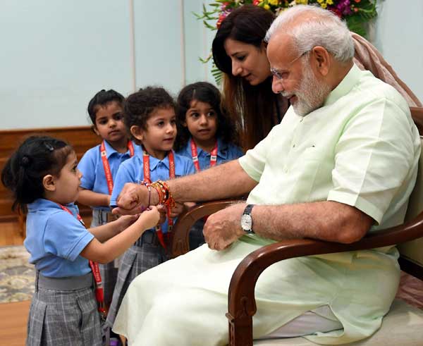 Read MoreChildren tying ‘Rakhi’ on the Prime Minister Narendra Modi’s wrist on the occasion of ‘Raksha Bandhan’, in New Delhi on August 26.