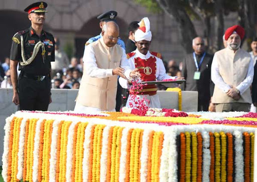The President Ram Nath Kovind pays floral tributes at the Samadhi of Mahatma Gandhi on his 149th birth anniversary at Rajghat in Delhi on October 2.
