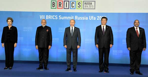 Prime Minister Narendra Modi with the President of Russia Vladimir Putin, President of Brazil Dilma Rousseff, President of China Xi Jinping and the President of South Africa Jacob Zuma in BRICS family photo, during the BRICS Summit, in Ufa, Russia.