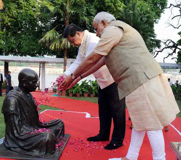 Prime Minister Narendra Modi and the Chinese President Xi Jinping paying floral tributes at the statue of Mahatma Gandhi, at the Sabarmati Ashram, in Ahmedabad on Wednesday.