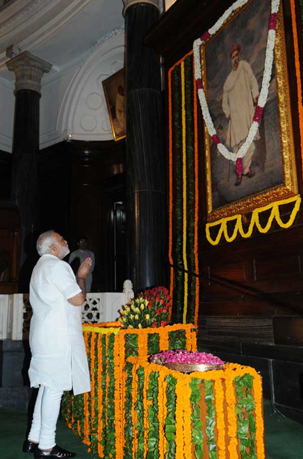 The Prime Minister Narendra Modi paying floral tributes to Lokmanya Bal Gangadhar Tilak on his birth anniversary, at Parliament House, in New Delhi on July 23.