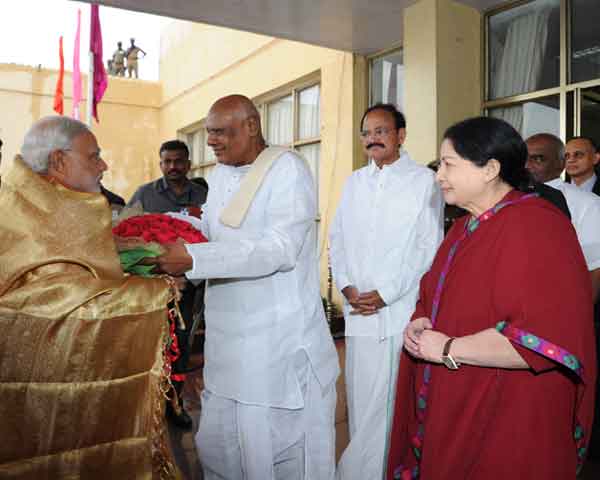 Prime Minister Narendra Modi being received by the Governor of Tamil Nadu Konijeti Rosaiah and the Chief Minister of Tamil Nadu J Jayalalithaa at Chennai airport in Tamil Nadu on June 29.