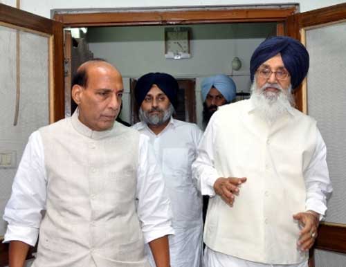 BJP President Rajnath Singhji's meeting with Prakash Singh Badal and Sukhbir Singh Badal at his residence in New Delhi on May 23.
