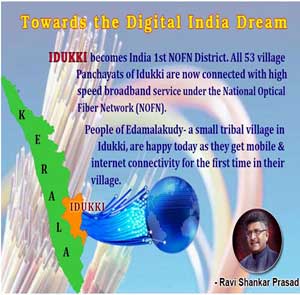 Read MoreIdukki: The Minister for Communications and IT Ravi Shankar Prasad inaugurated the launch of the high speed broadband for the entire Idukki district of Kerala. (Read in Hindi: इदुक्की बना पूर्ण रूरल ब्रॉडबैंड कवरेज वाला भारत का पहला जिला)