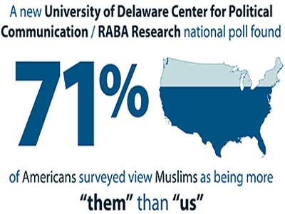 A new University of Delaware Center for Political Communication/ RABA Research poll found nearly three-fourths (71%) of Americans surveyed view Muslims as being more "them" than "us."